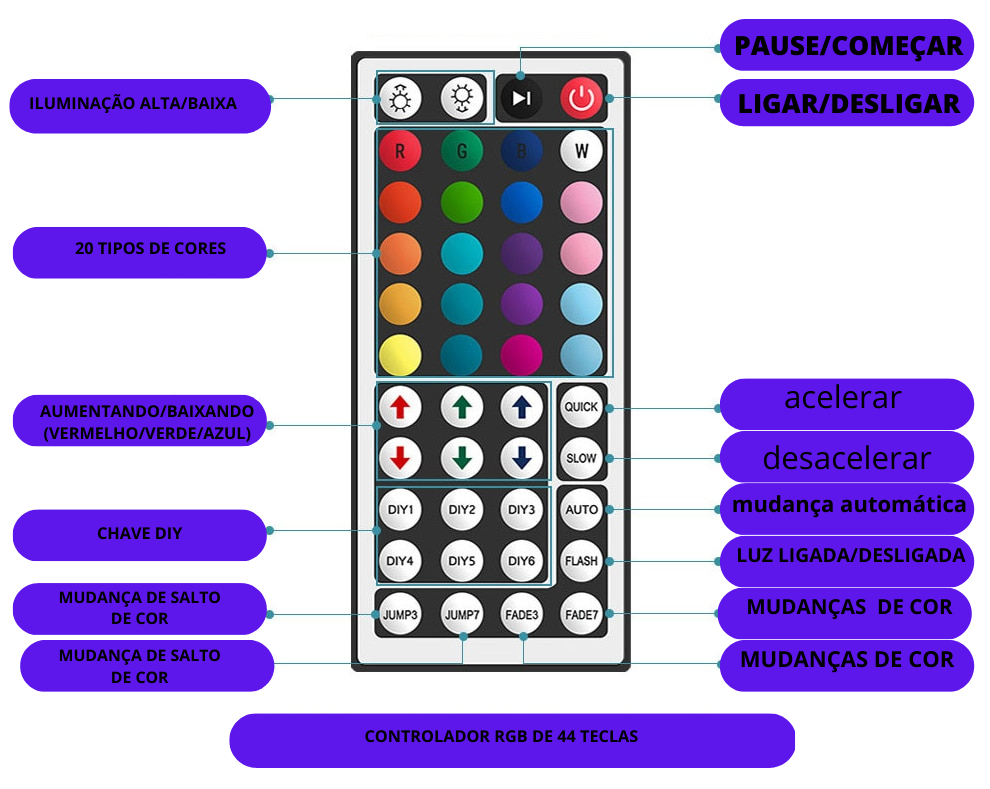 24 teclas de controle remoto, pode mudar 16 cores estáticas, selecione 4 modos dinâmicos e ajustar o brilho de 10 níveis. Totalmente controlado pelo controle remoto, não importa onde você está na sala, ele pode ser facilmente escurecido e comutado.